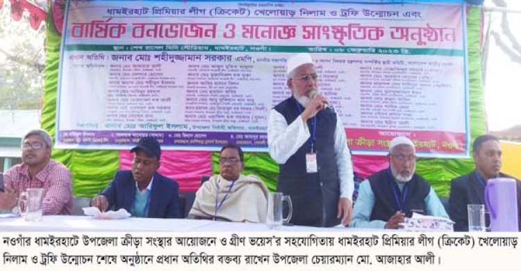 নওগাঁর ধামইরহাটে জমকালো আয়োজনে ধামইরহাট প্রিমিয়ার লীগ (ক্রিকেট) এর ট্রফি উন্মোচন করা হয়েছে। ৮ ফেব্রুয়ারী বিকেল ৪ টায় শেখ রাসেল মিনি স্টেডিয়ামে উপজেলা ক্রীড়া সংস্থার আয়োজনে ও গ্রীণ ভয়েস’র বিশেষ সহযোগিতায় ধামইরহাট প্রিমিয়ার লীগ (ডিপিএল) এর খেলোয়াড় নিলাম ও ট্রফি উন্মোচন করেন অনুষ্ঠানের প্রধান অতিথি উপজেলা চেয়ারম্যান মো. আজাহার আলী। এ সময় উপজেলা আওয়ামী লীগের সভাপতি ও সাবেক উপজেলা চেয়ারম্যান দেলদার হোসেন, সরকারি এম এম কলেজের প্রাক্তন অধ্যক্ষ ইতিহাসবিদ অধ্যাপক মো. শহীদুল ইসলাম, উপজেলা ভাইস চেয়ারম্যান সোহেল রানা, উপজেলা ক্রীড়া সংস্থার সম্পাদক প্রভাষক মিনহাজুল হক সরকার শিবলী, উপজেলা ফুটবল এসোসিয়েশনের সম্পাদক প্রভাষক আবু হানিফ, স্পোর্টস একাডেমিক সভাপতি হুমায়ন কবির, সাংগঠনিক সম্পাদক আবু সুফিয়ান খান বাবু, পৌর কাউন্সিলর মেহেদী হাসান, বিশিষ্ট ব্যাংকার মেহেদী হাসান অলিভ, উপজেলা ক্রীড়া সংস্থার যুগ্ম সম্পাদক মাহমুদ আলী, বেন ইয়ামিন সরকার, ভলিবল এসোসিয়েশনের সভাপতি মোস্তাফিজুর রহমান তোতা, সম্পাদক আরমান হোসেন রকি, টেবিল টেনিস এসোসিয়েশনের সভাপতি মুরাদুজ্জামান ইমন, উপজেলা ক্রিকেট এসোসিয়েশনের সভাপতি রাকিব হাসান প্লাবন, সম্পাদক রুহেল আহমেদ সোনালী সংঘ স্পোটিং ক্লাবের সভাপতি ডেন্টিস্ট শামিম রেজা,সোনালী স্বপ্ন’র প্রধান সমন্বয়ক ও আসাদুর রহমান শাহিন, উপজেলা প্রেস ক্লাবের যুগ্ম আহবায়ক ও সিনিয়র সাংবাদিক এম এ মালেক প্রমুখ সহ ৪টি দলের টিম লিডার ও বিভিন্ন পর্যায়ের খেলোয়ার উপস্থিত ছিলেন। একই অনুষ্ঠানে সংস্থার বার্ষিক বনভোজন ও চোঁখ ধাধানো সাংস্কৃতিক অনুষ্ঠানে অনুষ্ঠিত হয়।